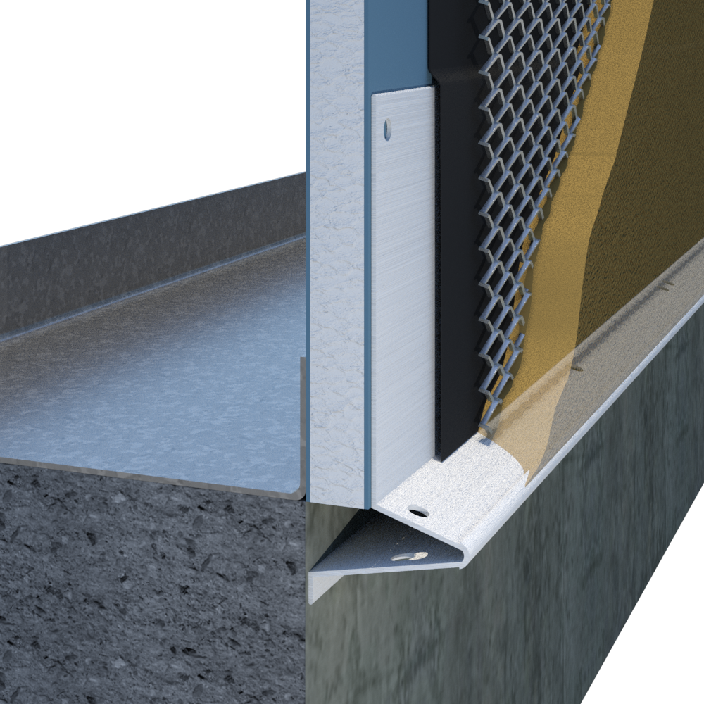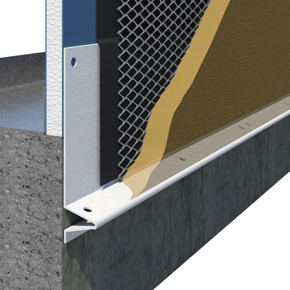 Designed to direct moisture from stucco and to act as a stop. Install on frame construction where stucco and foundation walls meet.