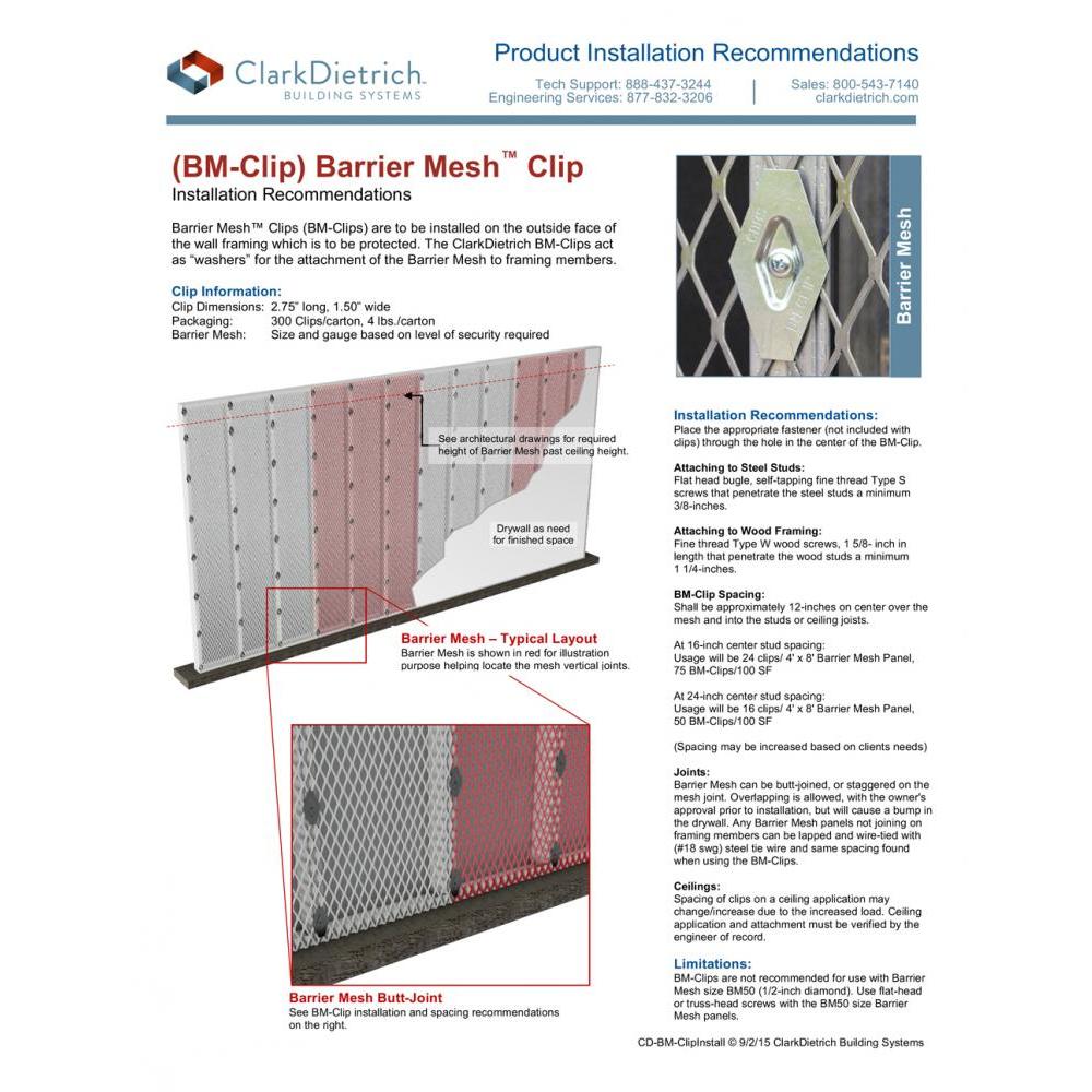 ClarkDietrich BM-Clips are high-strength steel components which provide secure attachment of Barrier Mesh metal panels to wood or steel stud framing for a complete Barrier Mesh System. The ClarkDietrich BM-Clips act as “washers” for the attachment of the Barrier Mesh to framing members. 300 clips/carton. BM-Clips are available upon request.