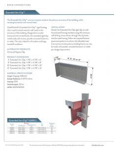 Attach the Extended Uni-Clip rigid clips to cold-formed steel framing members using #12 minimum self-drilling screws driven through the clip holes into the steel framing. Follow the required fastener placement patterns to achieve the allowable load. Connections to the primary building frame can also be made with powder-actuated fasteners or welds per design requirement.