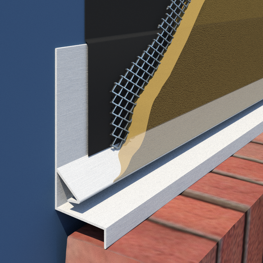 Designed to provide a flashing transition from stucco, siding, stone over a brick ledge, at a wall transition.
