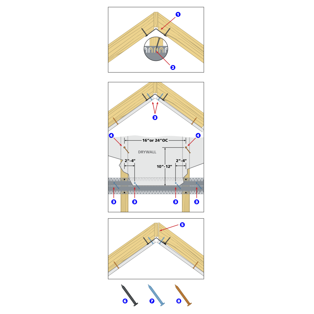 Adjust X-Crack to desired angle and use drywall screws to fasten it to ceiling framing members. Install drywall over X-Crack using fine or coarse threaded screws – be sure screws only penetrate drywall and X-Crack but miss trusses or ceiling joists by 2 to 4 inches. You must install the last screws in the field 10 to 12 inches away from X-Crack to allow for lumber movement. By missing the framing members and fastening drywall boards only to X-Crack; finished inside corners will not move or crack. Use Strait-Flex Mid-Flex250 or Mid-Flex300 flexible corner trim to complete installation.