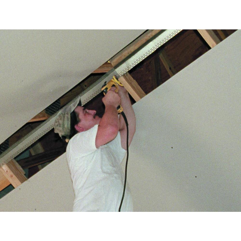 Let X-Crack float over irregular framing members to create a straight line. Six screws per length is all that is required to hold X-Crack in place. The last screws in the field secures drywall to ceiling - and the screws through drywall into body of X-Crack secures inside corners. Install drywall over X-Crack with fine or coarse drywall screws.
