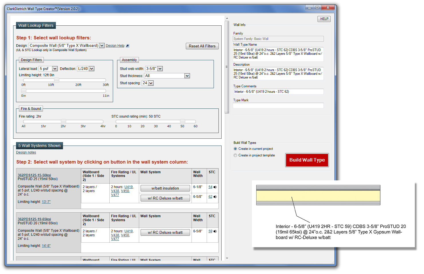 The ClarkDietrich Wall Type Creator is the first Revit® add-in design tool that intelligently incorporates detailed information on wall elements and design properties, such as UL assemblies based on fire rating requirements, STC sound ratings and limiting height design. This type of interactive platform, in which details have been linked together, is truly unparalleled and gives architects and contractors everything needed to successfully design even the most challenging wall assemblies.